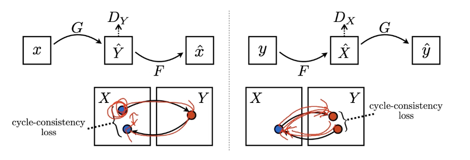 X 에서 G를 통해 Y로 가면, Y는 DY의 discriminator를 통해 정말 Y 같은지 판별