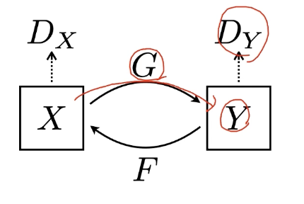 Y에서 F를 통해 X로 가면, X는 DX의 discriminator를 통해 정말 X 같은지 판별
