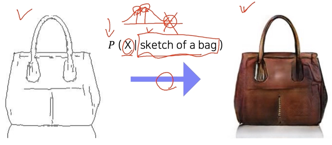 다음과 같은 스케치가 주어졌을때 분포에서 가장 이런 이미지일 확률이 가장 높아 하는 것을 sampling하는 것