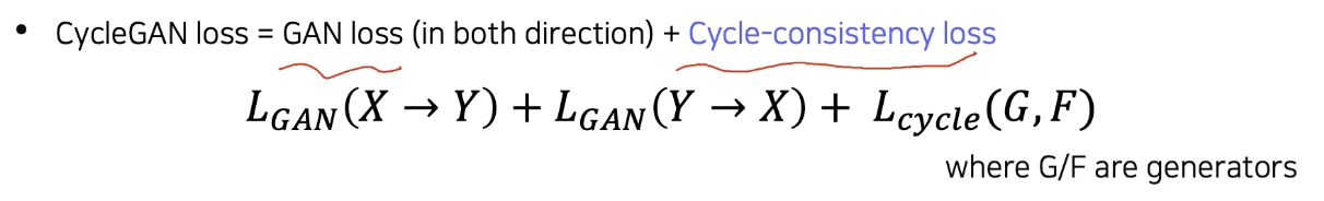 Cycle consistency loss: 이미지하고 translation 된 결과하고, 다시 돌아왔을 때 원본이미지와 동일해야 한다.