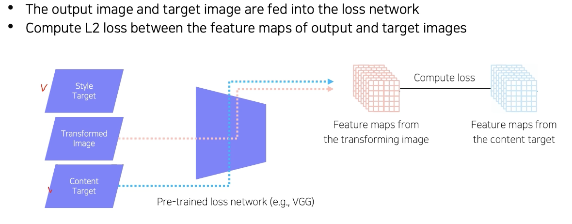 이 경우에도 transform이미지와 style target 이미지를 각각 VGG에 넣어서 feature map을 준비한다.