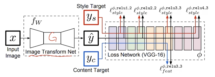 $\rightarrow$ 즉 loss network(VGG)는 학습하지 않고 $\hat{y}$ 즉 image transform network만 학습 업데이트
