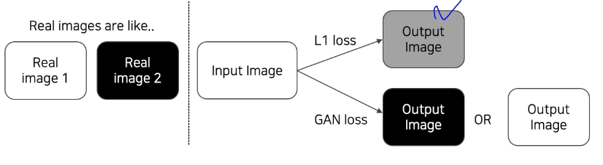하지만 GAN은 회색데이터를 본적 없어서 real data로 판별하지 않는다. 이로 인해 검은색 흰색을 맞추기 위해 적합한 loss를 가지고 있다.
