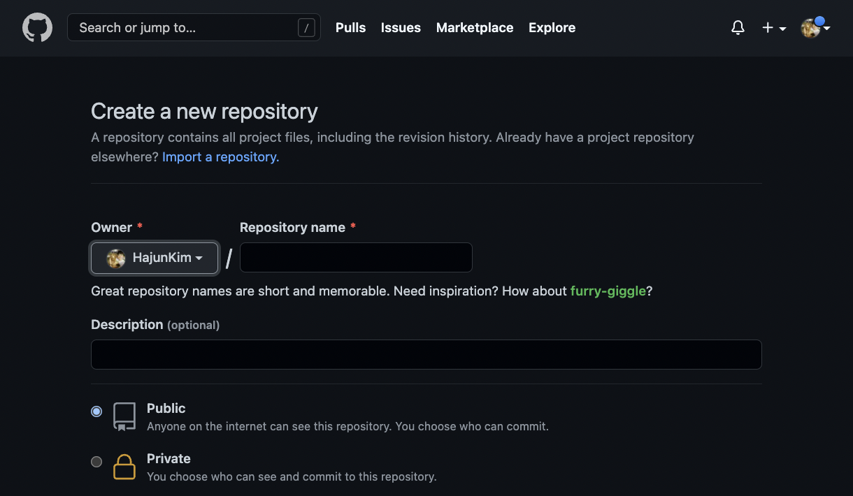 이때 만약 위 주소를 입력하게 되면 내 github에는 다음의 이름을 갖는 새로운 repository가 생성된다.