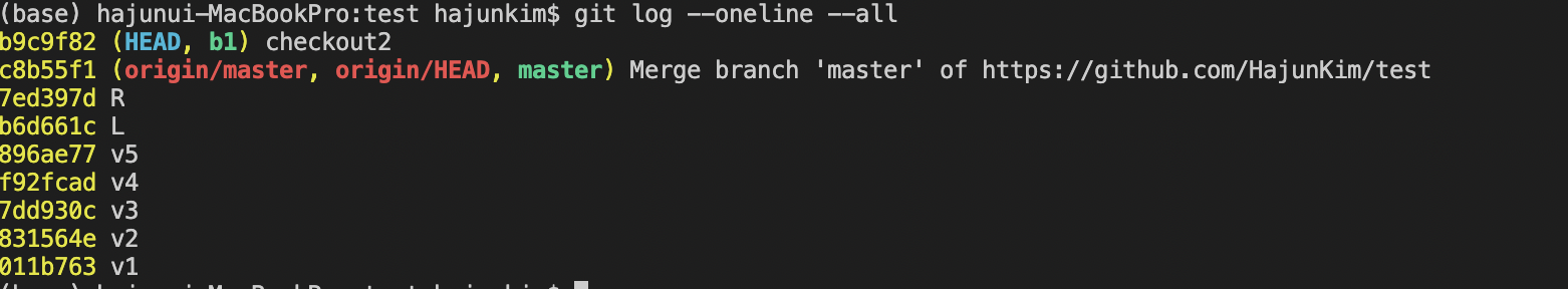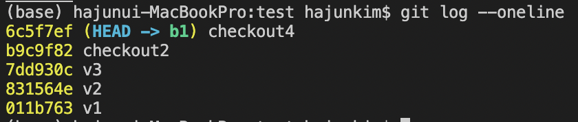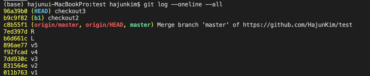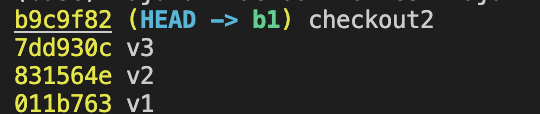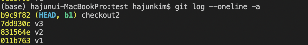 다만 유의해야 할 점은 log에 나타난 것 처럼 HEAD 는 checkout2 를 가리키지, b1 을 가리키는게 아니다.