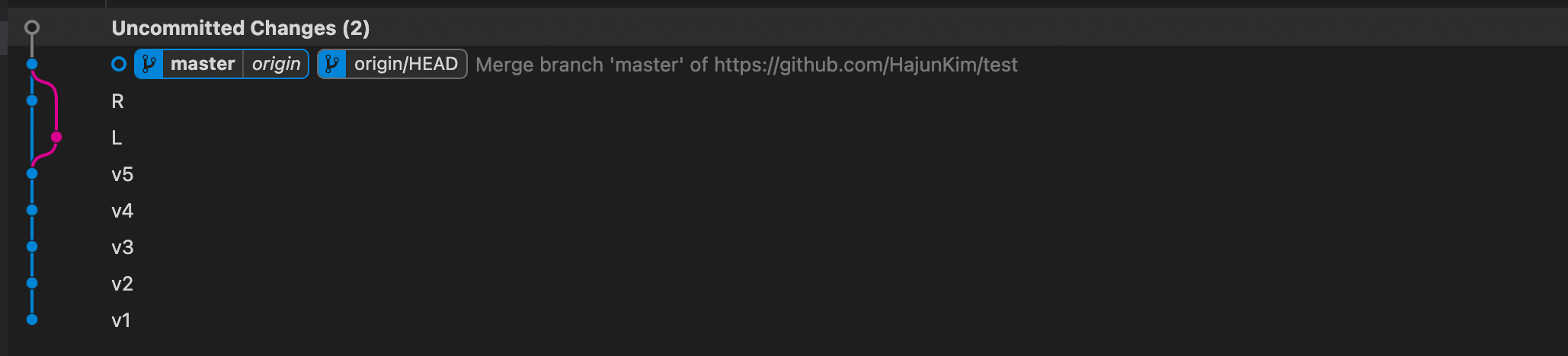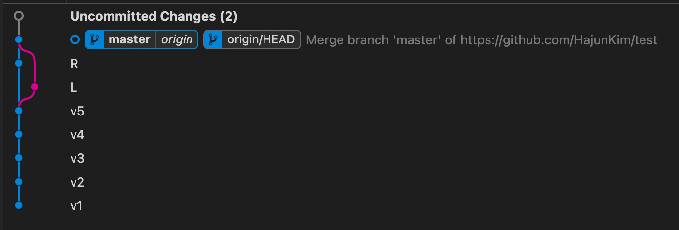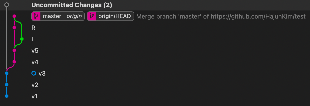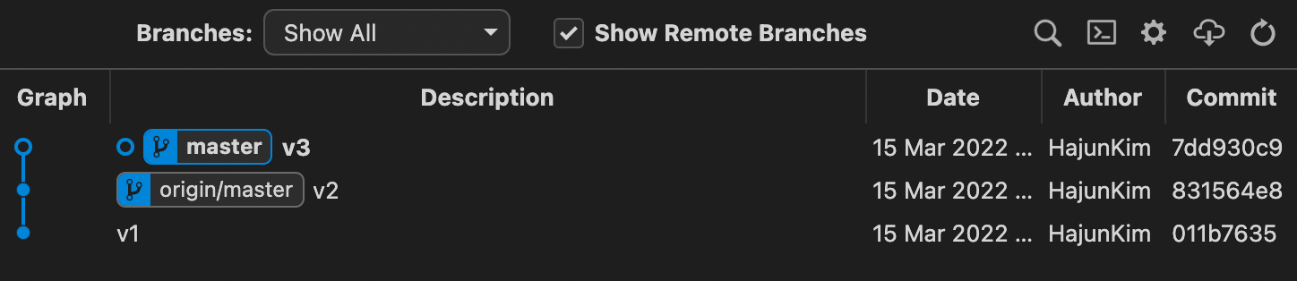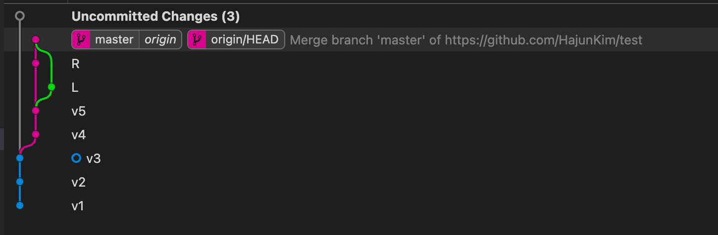 master는 가장 마지막 commit을 가리킨다. 즉, 원격에서는 v2이고, 로컬에서는 v3이다.