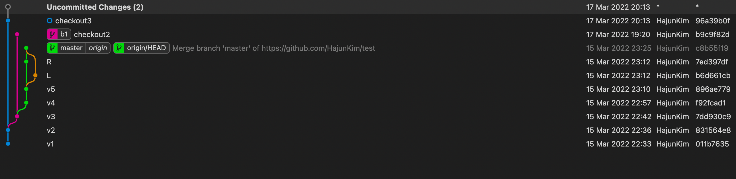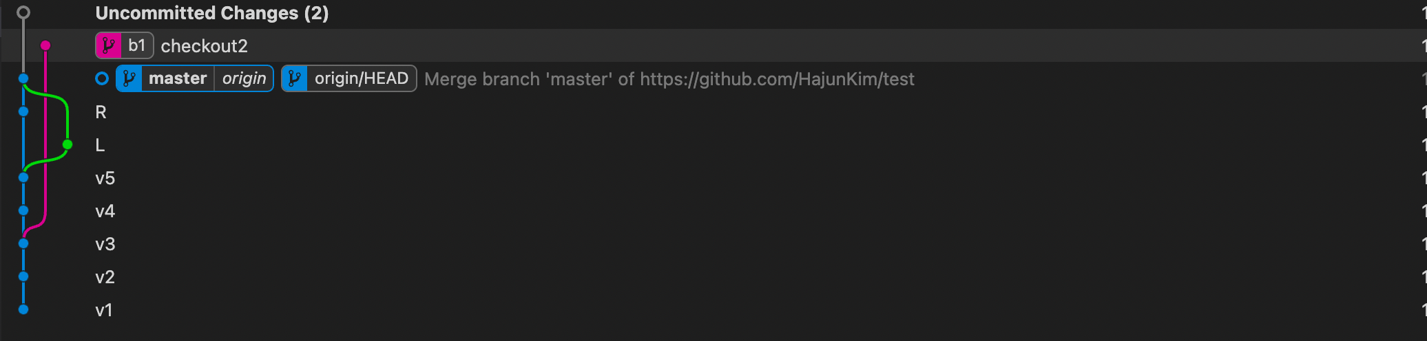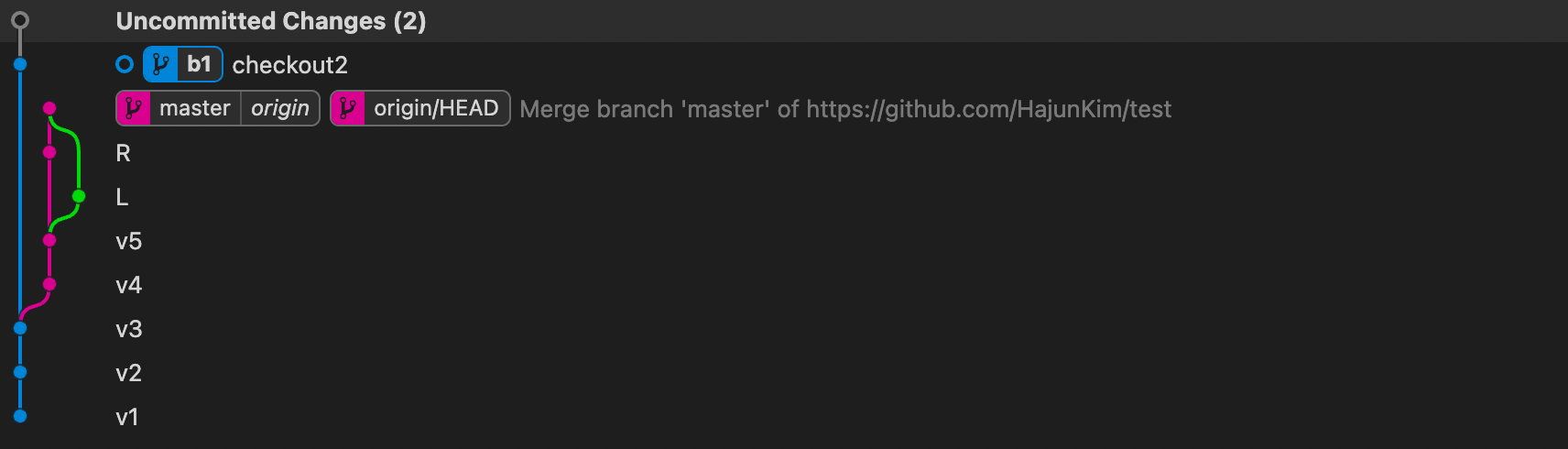 여기서 checkout 이라는 새로운 버전을 commit하자 추가 된 것을 볼 수 있다.