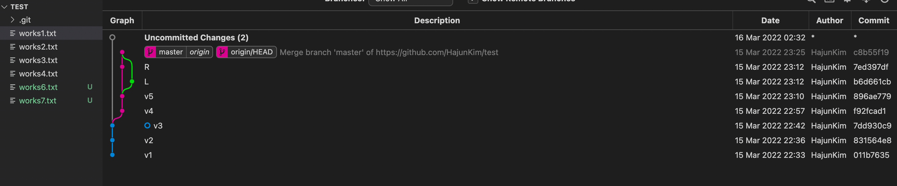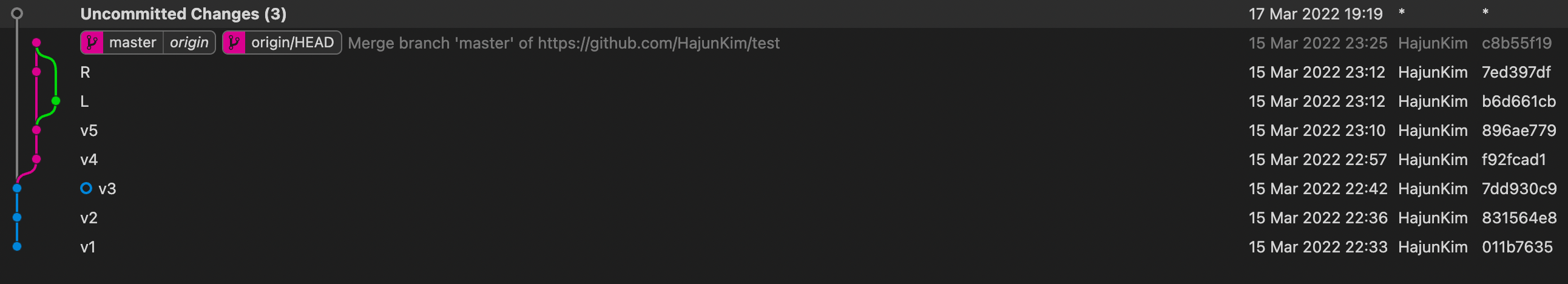 새로 생성한 파일을 "v3" 라는 commit 명으로 add 하고 commit을 완료하자 다음과 같이 나타났다.