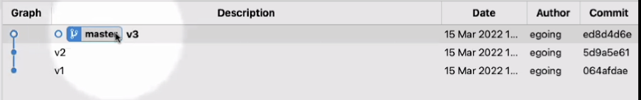 Graph를 봐도 master 를 가리키지 않고 바로 v3 를 가리킨다. (가리킬 때 bold 처리 된다. 거지같은 UI)