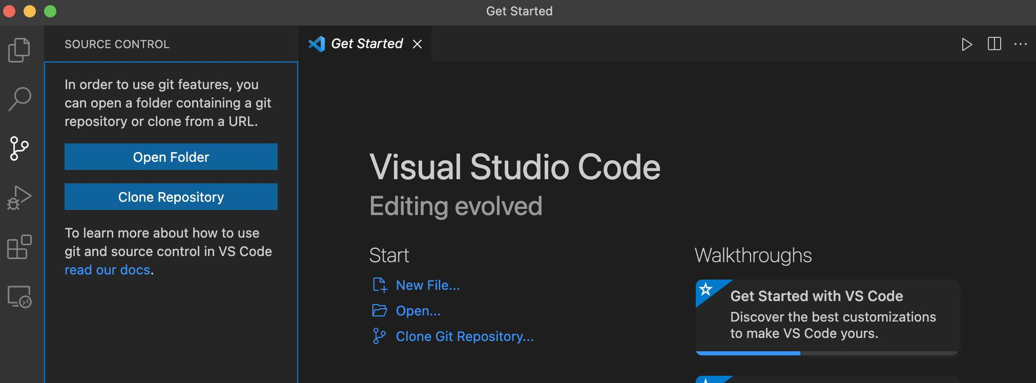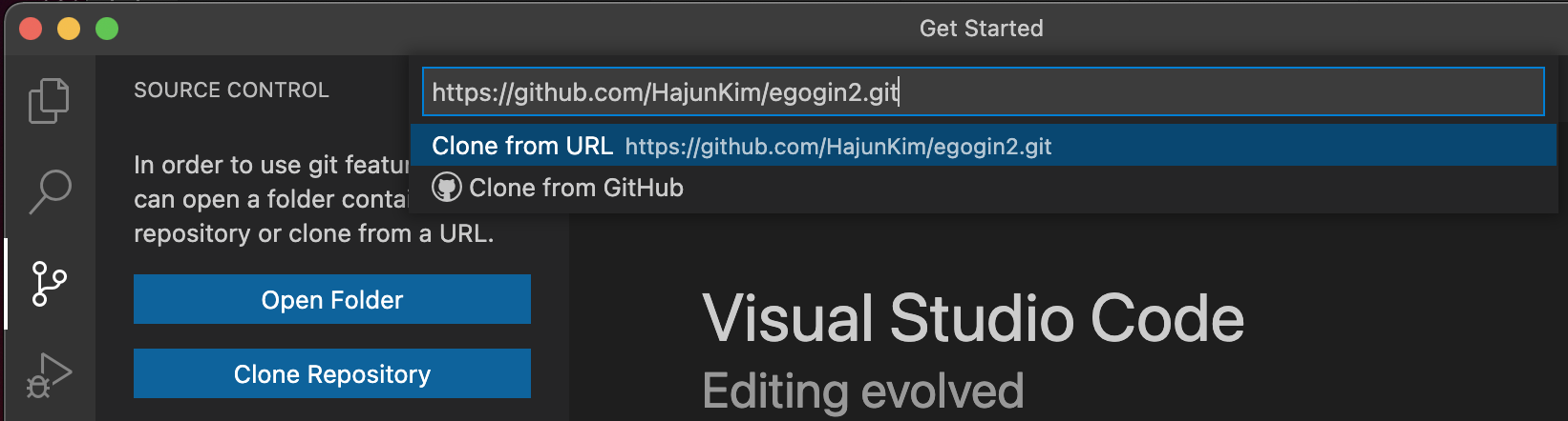 vs code 메인 화면에서 다음의 버튼을 눌러 원격 저장소를 복제할 수 있다.