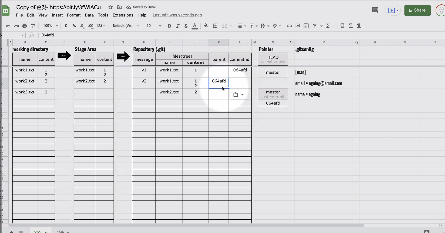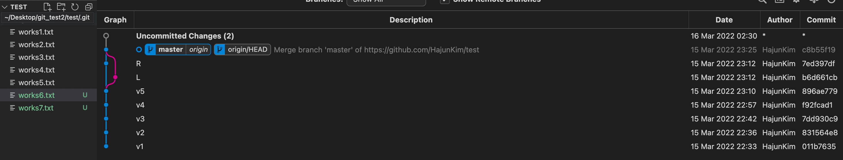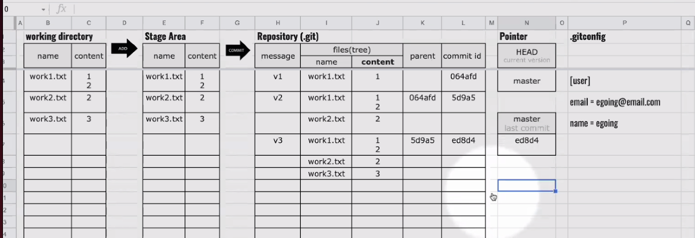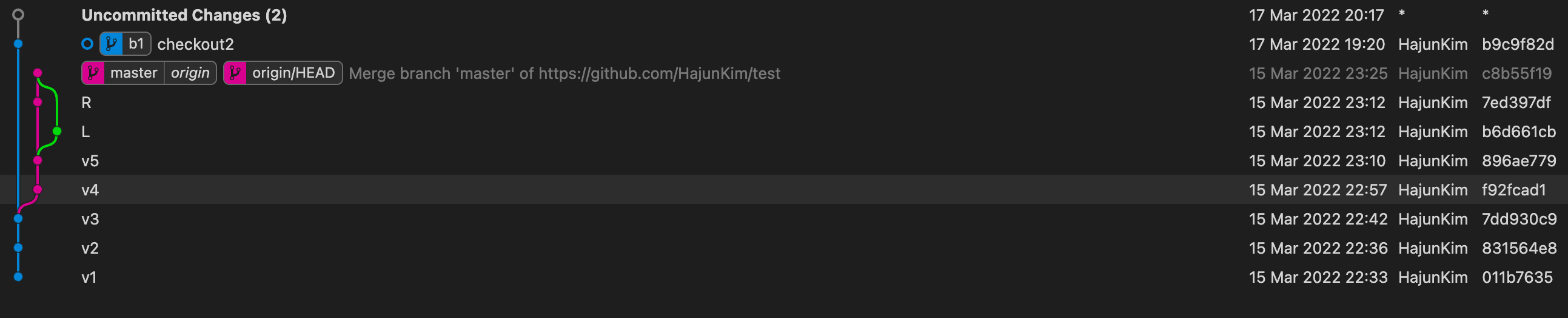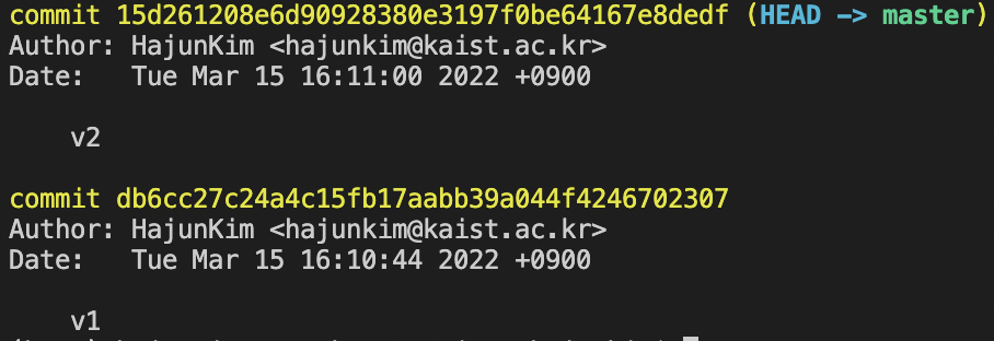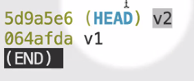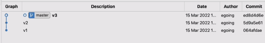 이걸 보면 working directory 가 v2 겠구나, 를 알 수 있다. (만약 같지 않다면 commit 이 완료되지 않은 내용이 있겠구나 ~ 할 수 있다.)