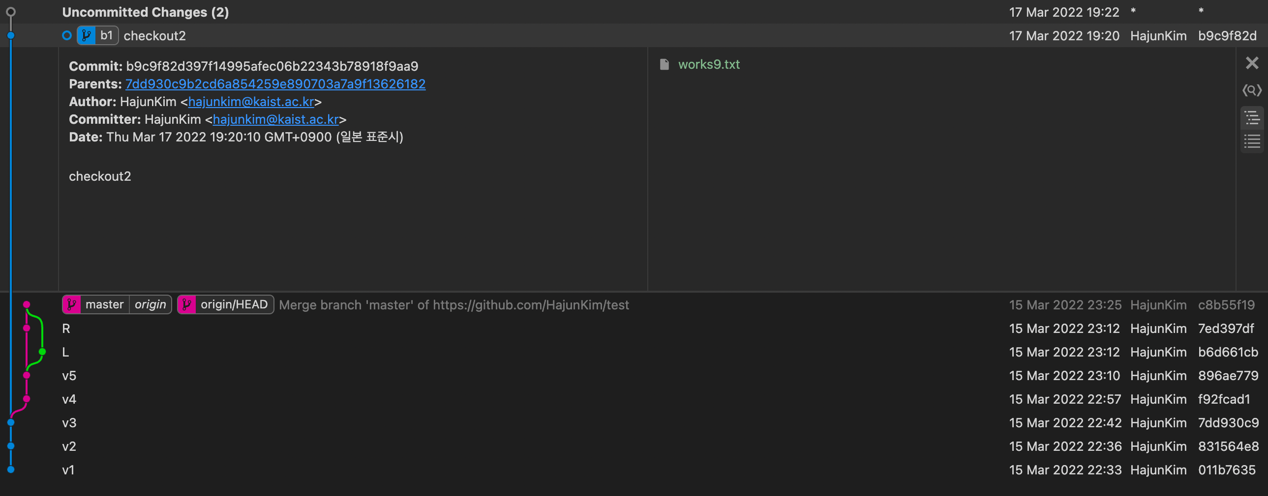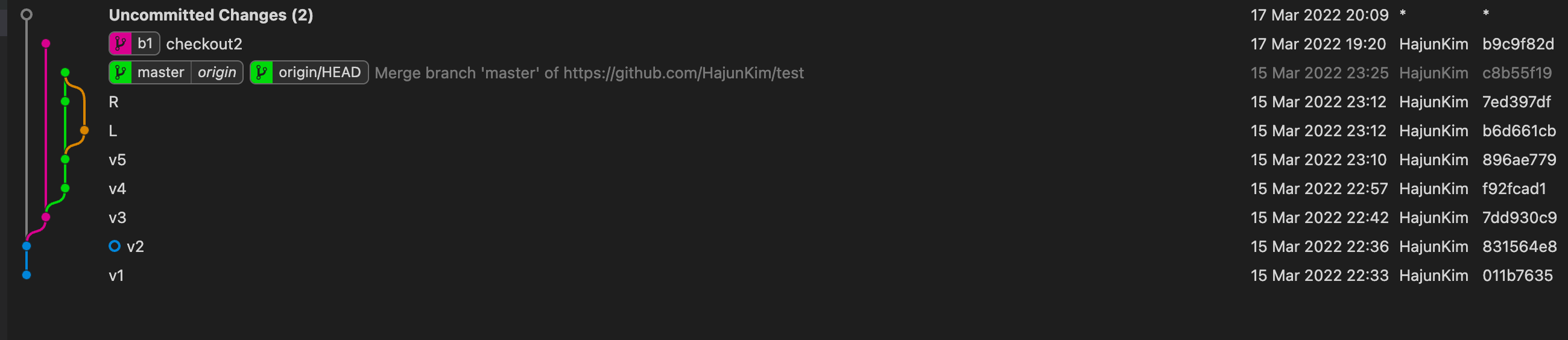 여기서 checkout master 를 하면 아까와 같은 상황이 발생하니 버전 checkout2에 branch를 생성한다.