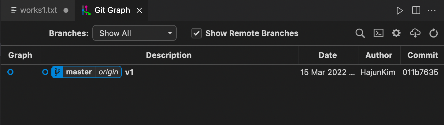 add 했을 때까지는 graph에 어떠한 변화도 없다가 commit을 마친 후에 어떠한 변화가 나타난 것을 알 수 있다.