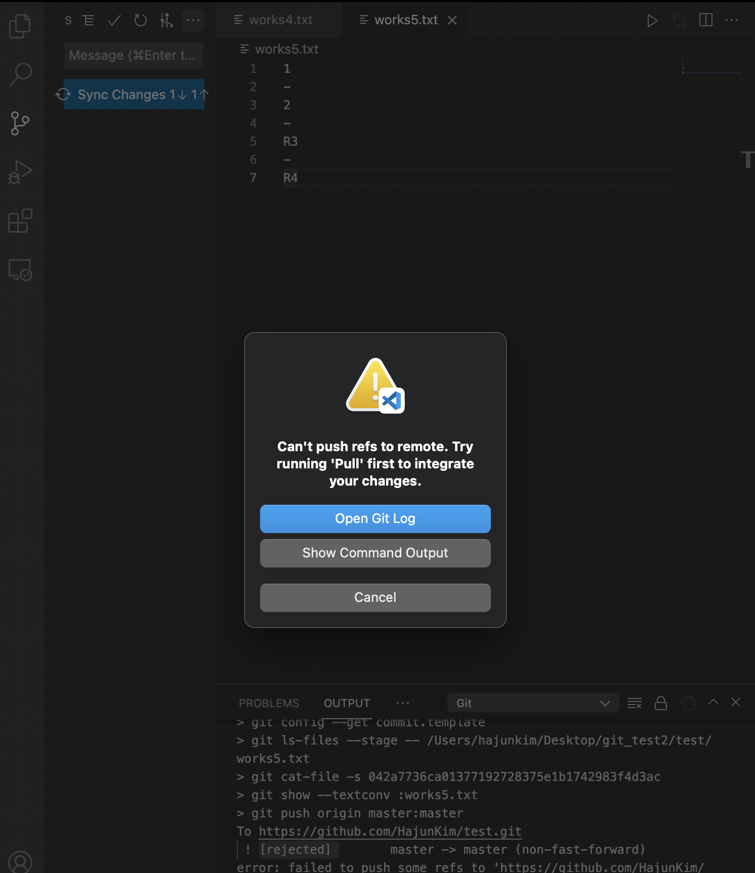 한 로컬에서는 push가 되지만 뒤 늦게 push 한 로컬은 reject당했다.