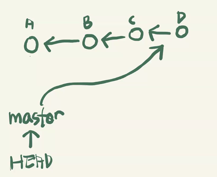 새로운 commit 발생시 버전은 D 를 가리킨다. master 즉 최종단에 commit이 추가되는 것으로 보인다.