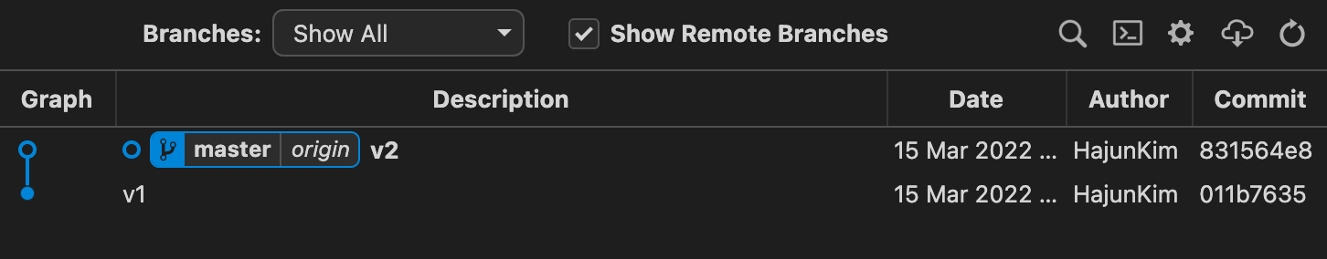 여기서 origin/master 에서 origin은 우리의 원격 저장소의 이름이다. 즉, origin/master 에 등록된(push된) 가장 최근의 저장 내역이 v2 라는 것이고, 로컬에는 commit 까지 완료했으므로 저장되어 v3 를 가리킨다.