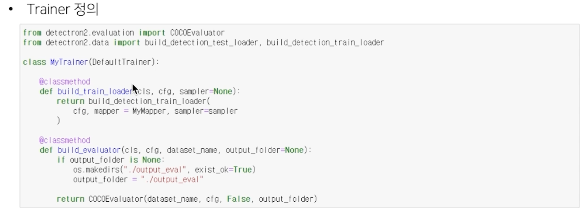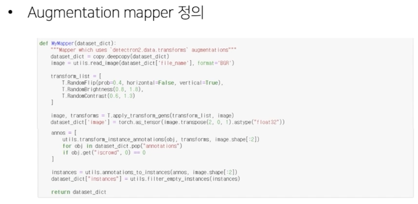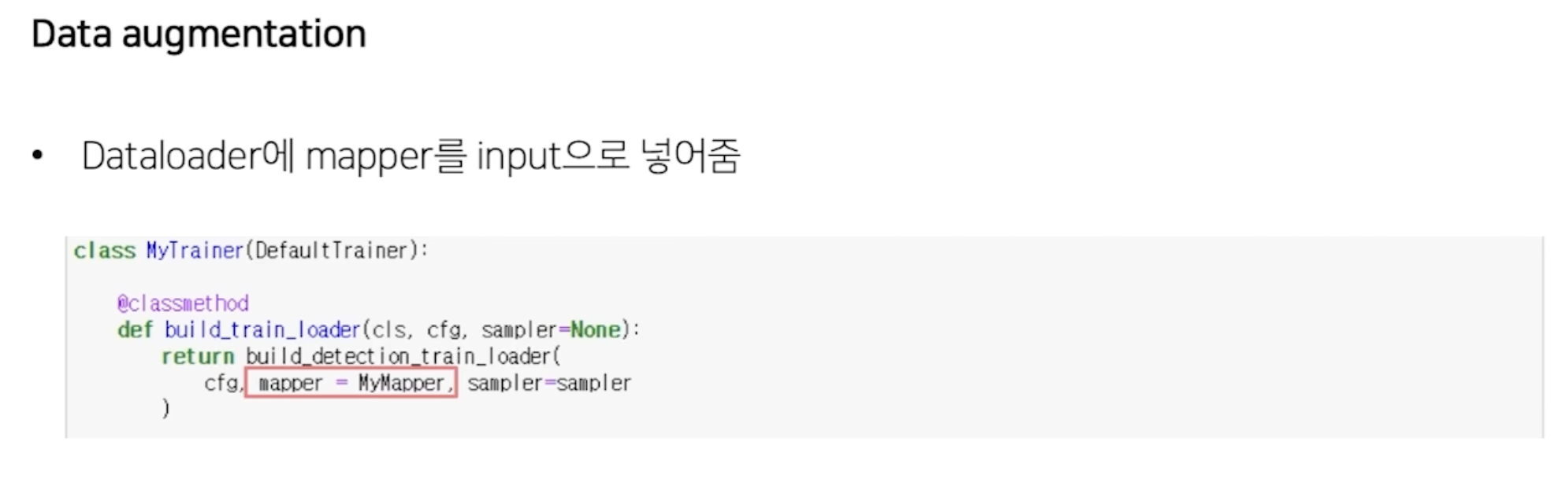 build_train_loader 재정의, mapper=MyMapper 에정의한 augmentation mapper 를 넘겨줘야 한다. 이를 위해 train loader 재정의