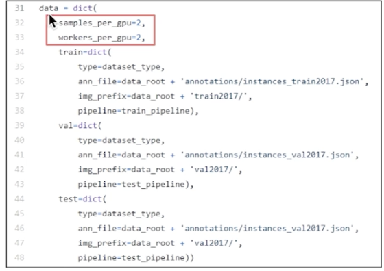 samples_per_gpu: gpu 1개당 올라갈 이미지 샘플의 개수