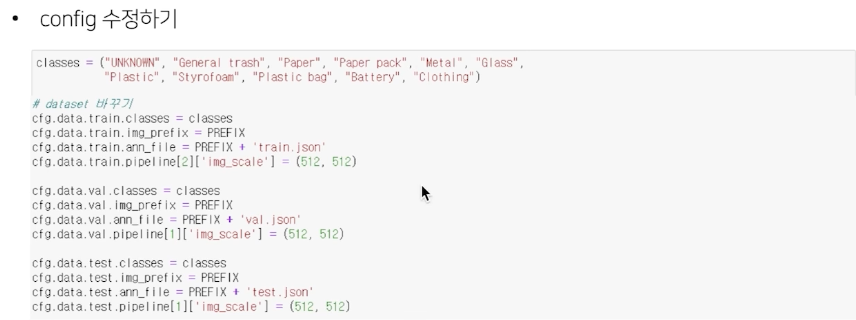 train : annotation file 위치, img_prefix 정의 필요, type 도 정의 필요 등..