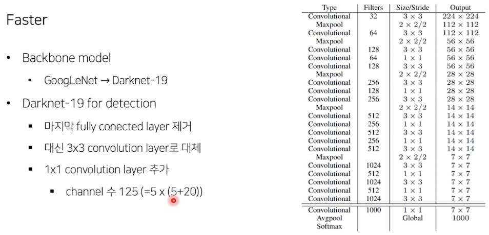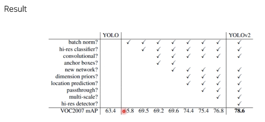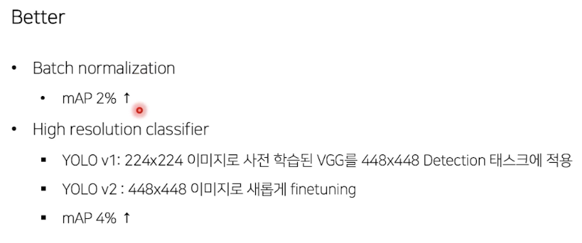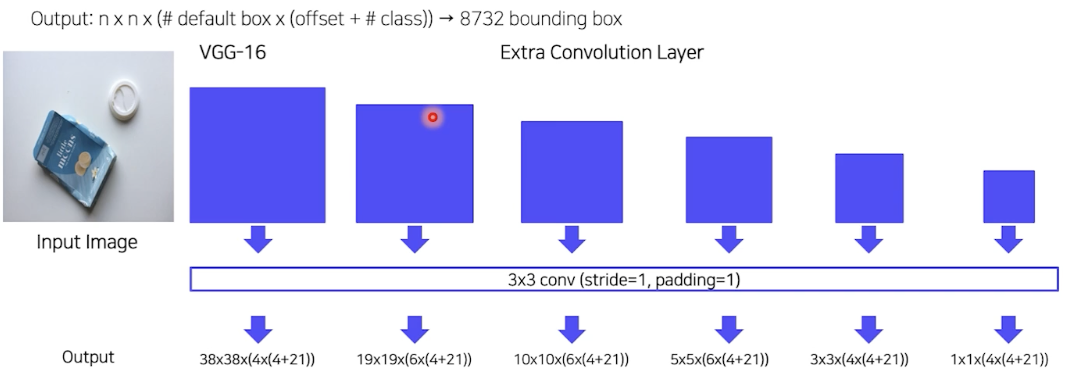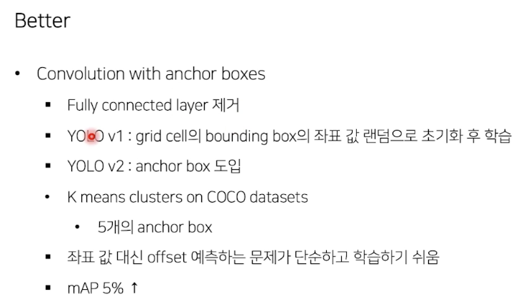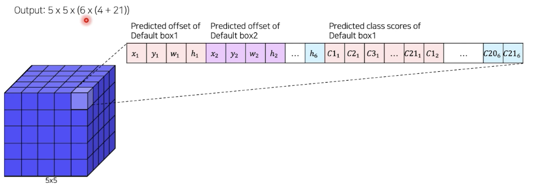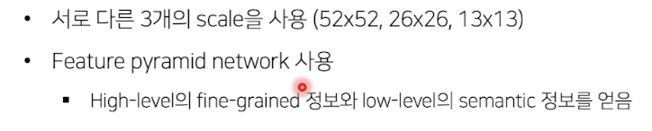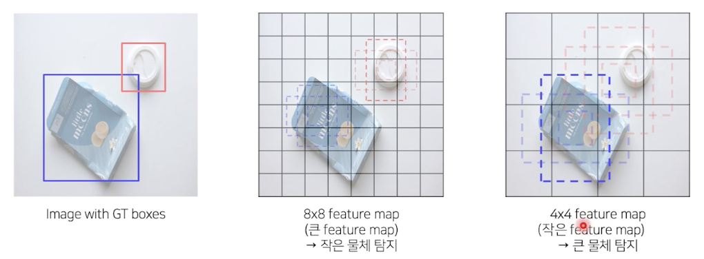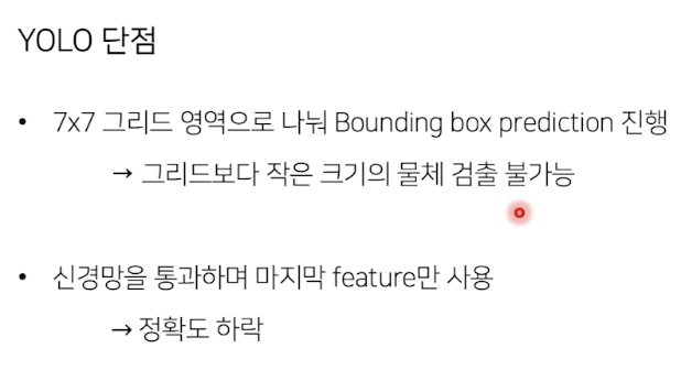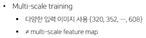 - SSD: feature map 여러번 뽑음, Yolo 는 마지막 feature map만 사용
