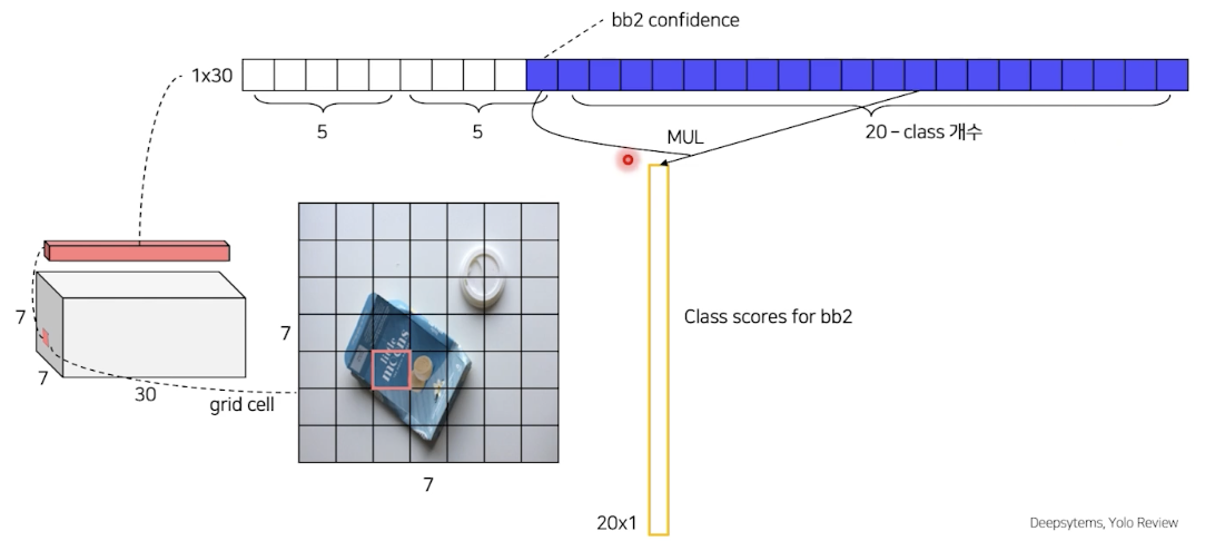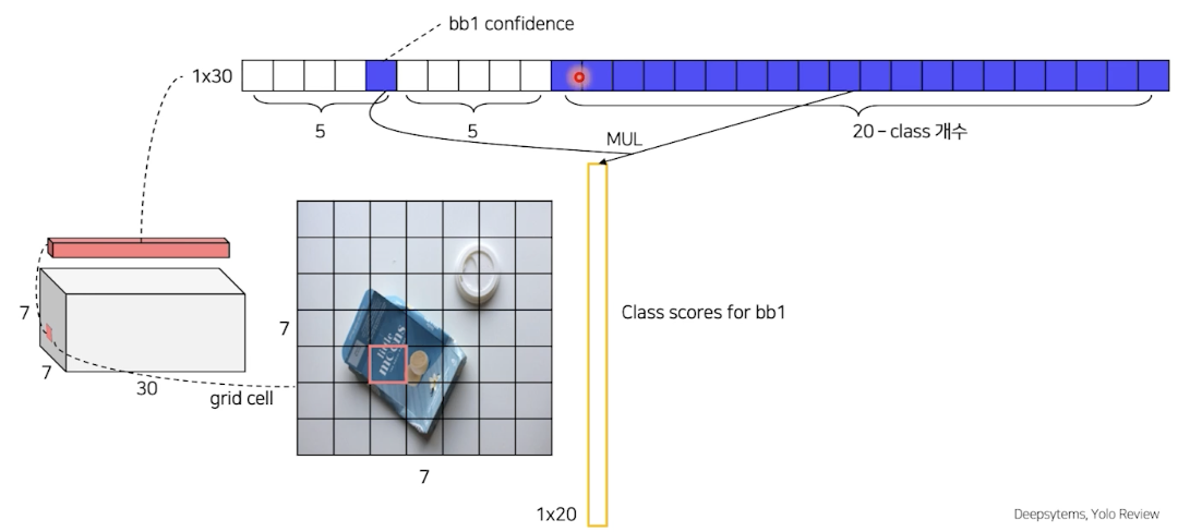 bbox1 confidence 확률과 각 class 에 대한 확률의 곱을 통해 bbox1에 대한 class score를 얻을 수 있다.