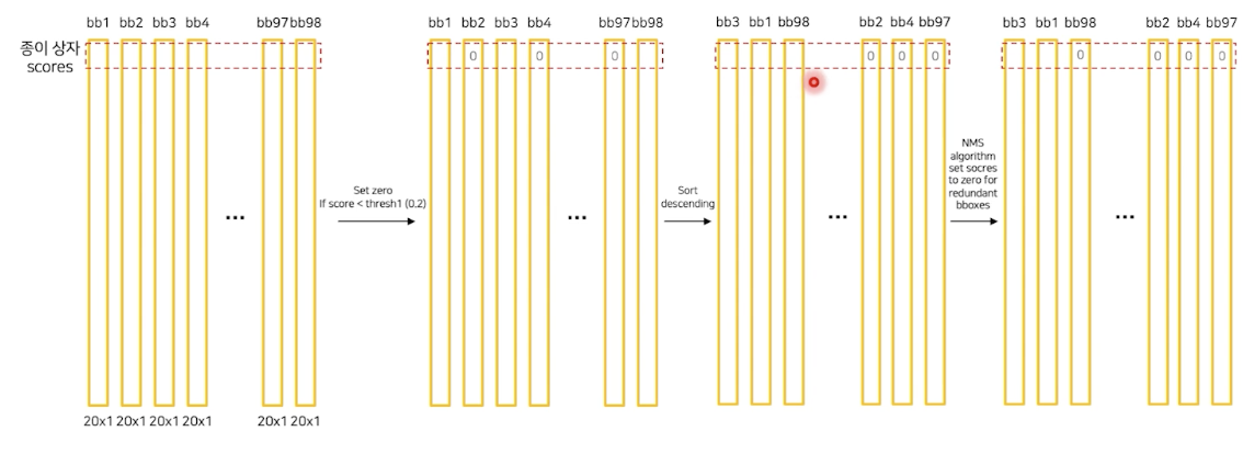 각각의 bboxes 의 class score을 확인하고, 정한 threshold 보다 낮은 경우 모두 정보 제거