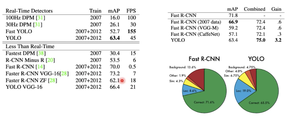 빠른 속도, 비교적 준수한 성능 (background erro는 특히 낮다.) Yolo로 background 솎아내고, Fast R CNN을 썼을 때 성능의 향상 (Ensemble)