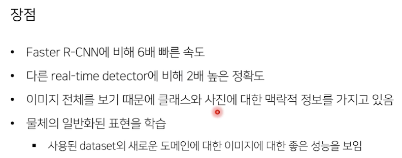 - 영역을 추출하지 않고 전체 이미지를 보기 때문에 객체에 대한 맥락적 이해가 높음 (background error가 낮음)