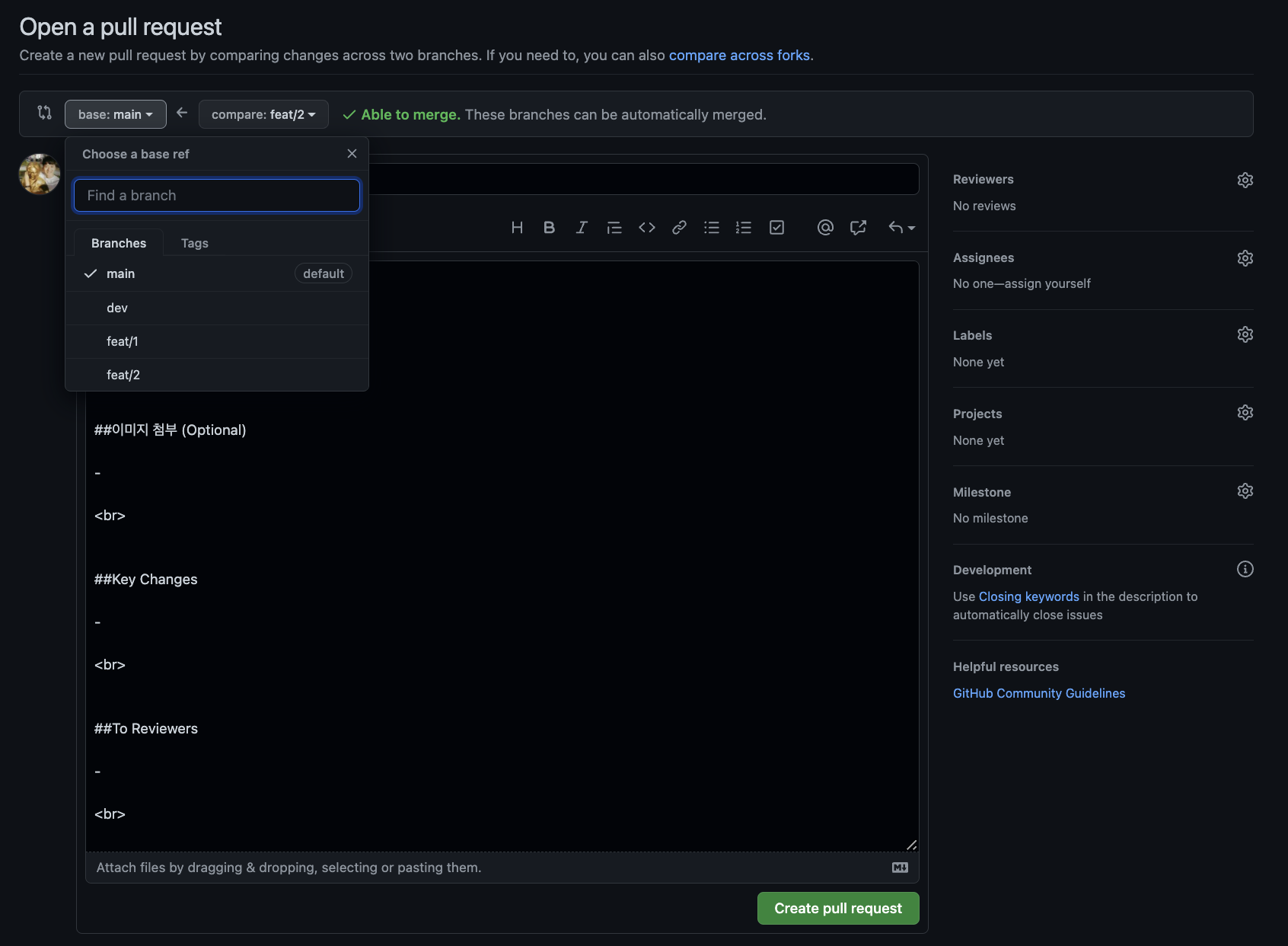 compare & pull request 버튼을 눌러보면 아래의 drop down 버튼을 통해 어디 branch에서 어느 branch로 수정내역을 반영할 것인지 확인한다.