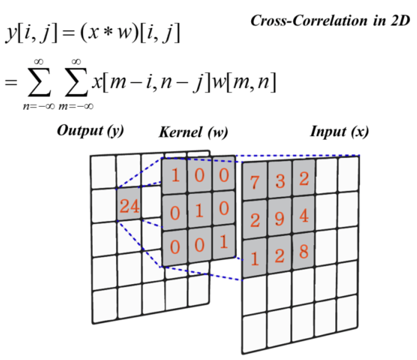 2차원 Convolution 연산은 입력 행렬에 해당하는 데이터에서 kernel을 x,y 방향으로 한칸씩 움직이며 적용한다.