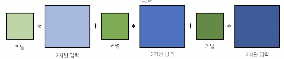 채널이 여러개인 2차원, 즉 3차원 입력의 경우 2D-Conv를 사용한다. 다만, 채널 개수만큼 kernel을 만들어 적용한다.