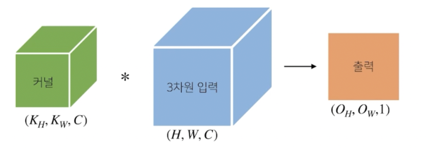 커널의 채널 개수와 입력의 채널 개수를 같게 설정하기 때문에, Conv 연산 후 출력에 해당하는 tensor 3차원의 차원은 1이 된다.