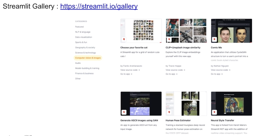 Streamlit Gallery 를 보면 공개 된 프로젝트의 source 코드를 참고하여 간단하게 구현해볼 수도 있다.