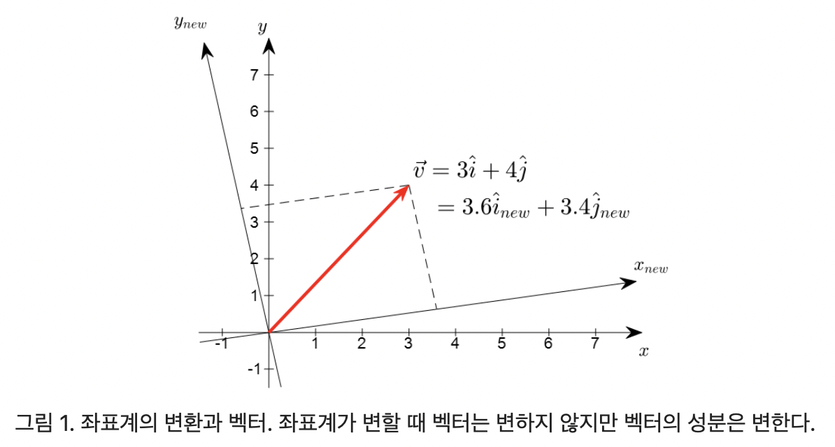 좌표계의 변환에 대해 불변적이라는 말은 아래 그림에서 처럼 좌표계가 변하더라도 벡터 그 자체는 가만히 있다는 것을 의미한다.
