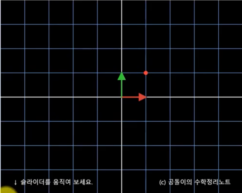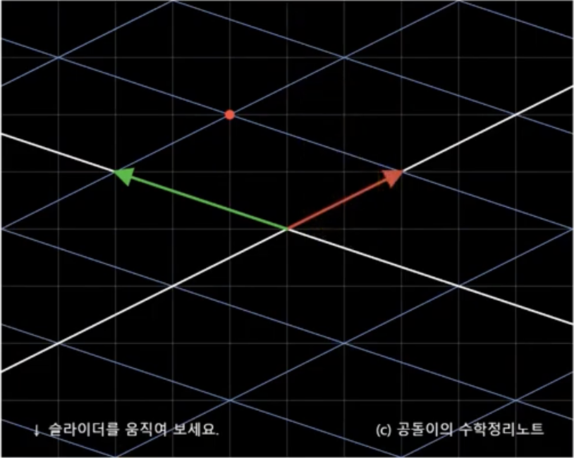 임을 알 수 있는데, 아래의 영상에서 처럼 이 값은 새로운 두 기저벡터의 1배와 1배의 합으로 표현될 수 있다.