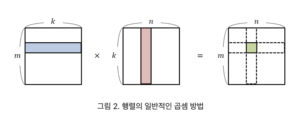 잘 뜯어 생각해보면, 왼쪽에 있는 행렬에서 행 하나를 가져오고 오른쪽에 있는 행렬에서 열 하나를 가져와서 계산하게 된다는 것을 알 수 있다.