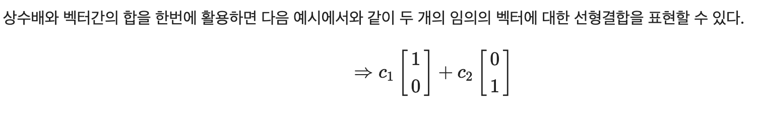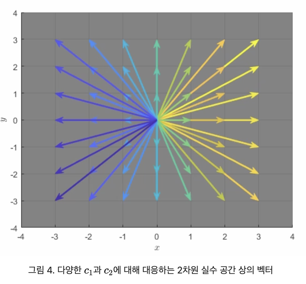 $c_1 , c_2$ 은 각각이 모든 실수에 대응될 수 있는데, $c_1 , c_2$ 가 바뀌면서 얻게되는 선형결합의 결과는 2차원 실수 벡터 공간 상에 있는 모든 벡터들에 대응되게 된다.