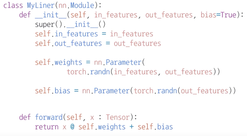 우리가 직접 지정할 일은 잘 없다 : 대부분의 layer에는 weights 값들이 지정되어 있음 (nn.Linear, nn.Conv ... etc)