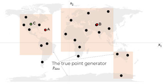 위 세계 지도를 살펴보자. '검은 점'이 generative model을 만들 때 학습한 데이터 셋이라 가정해보자. 학습 데이터 셋은 다음의 특징을 갖는다.