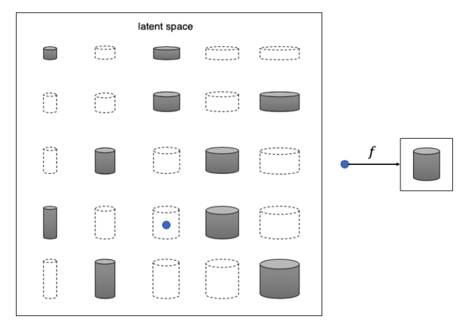 원기둥의 잠재 공간(latent space) 를 만들고자 한다고 가정해보자. 원기둥을 더 낮은 차원인 '잠재 공간(latent space)' 표현하면, 잠재 공간은 모든 작은 디테일을 기억하지는 않고 원기둥을 결정짓는 중요한 요소들인 기본 특성만(원기둥 같은 높이, 반지름, 길이, 그 외 보통 원기둥을 결정 짓는 요소들) 기억할 것이다. 잠재 공간에 저장 된 이러한 기본 지식들에 작은 인공적 디테일을(ex. 질감, 원기둥 색상) 더하여 데이터셋에 적합해 보이면서 한번도 본적 없는 새로운 샘플들이 생성되는데 사용한다.
