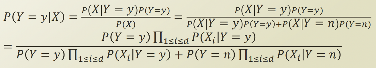 $P(X|Y = y)P(Y=y)$ 는 X 가 여러개가 되었을 때 parameter 의 수가 exponential 하게 증가하기 때문에 Naive Assumption 을 이용해서 개별 feature 들의 multiplication 형태 $P(Y=y)\prod_{1 \leq i \leq d}P(X_i |Y=y)$로 만들어주었다. 분모도 동일하게 적용해 주었다.
