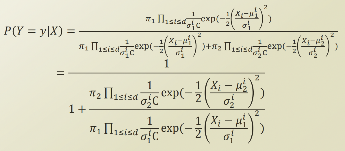물론, Bayes theorem 에 의해 성립이 되긴 하지만, $f_{NB}(x) = argmax_{Y=y} P(Y=y)\prod_{1 \leq i \leq d} P(X_i = x_i | Y = y)$ 형태, 여기서도 Gaussian 가정이 가미 된 아래 형태에서