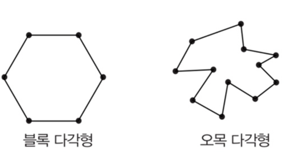 2. 임의의 두 꼭지점을 이은 선은 다각형의 내부에 있거나 다각형을 이루는 선 중에 하나다.