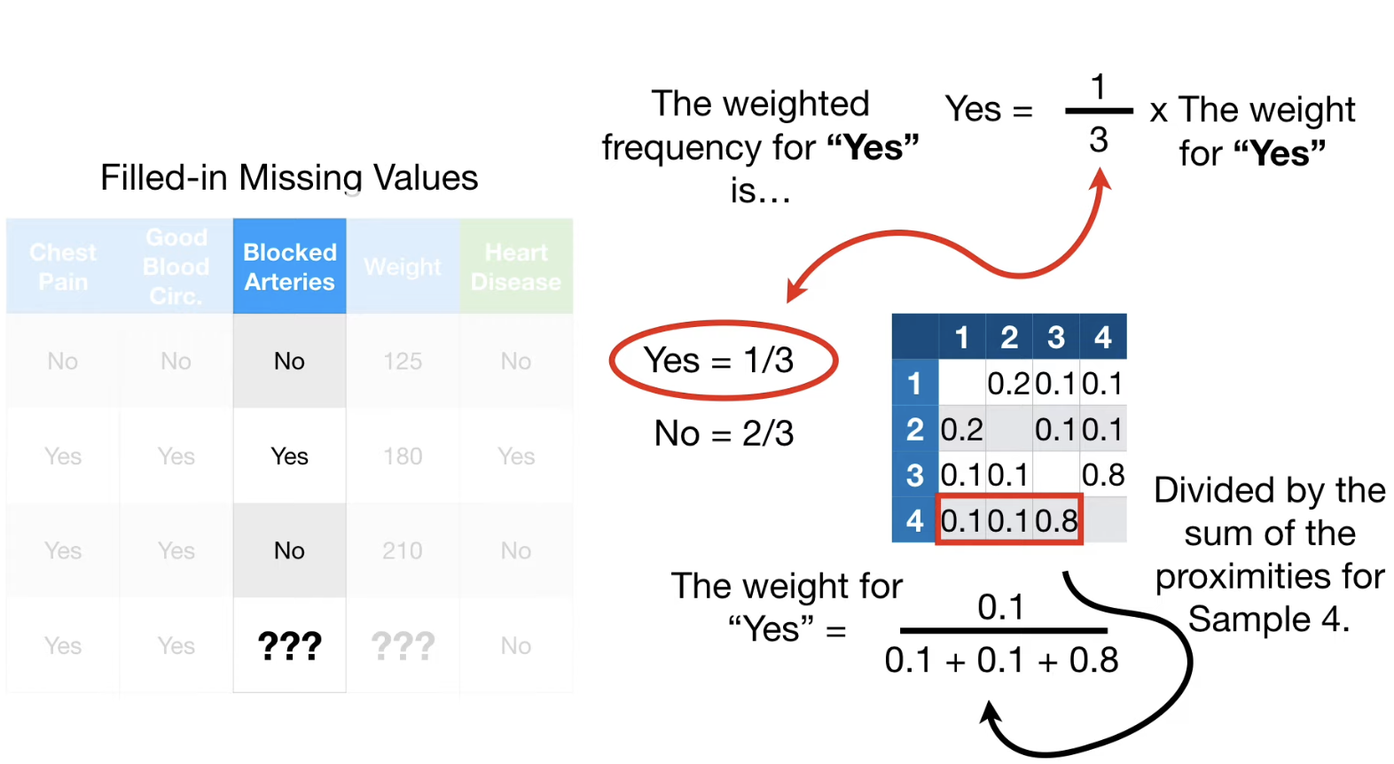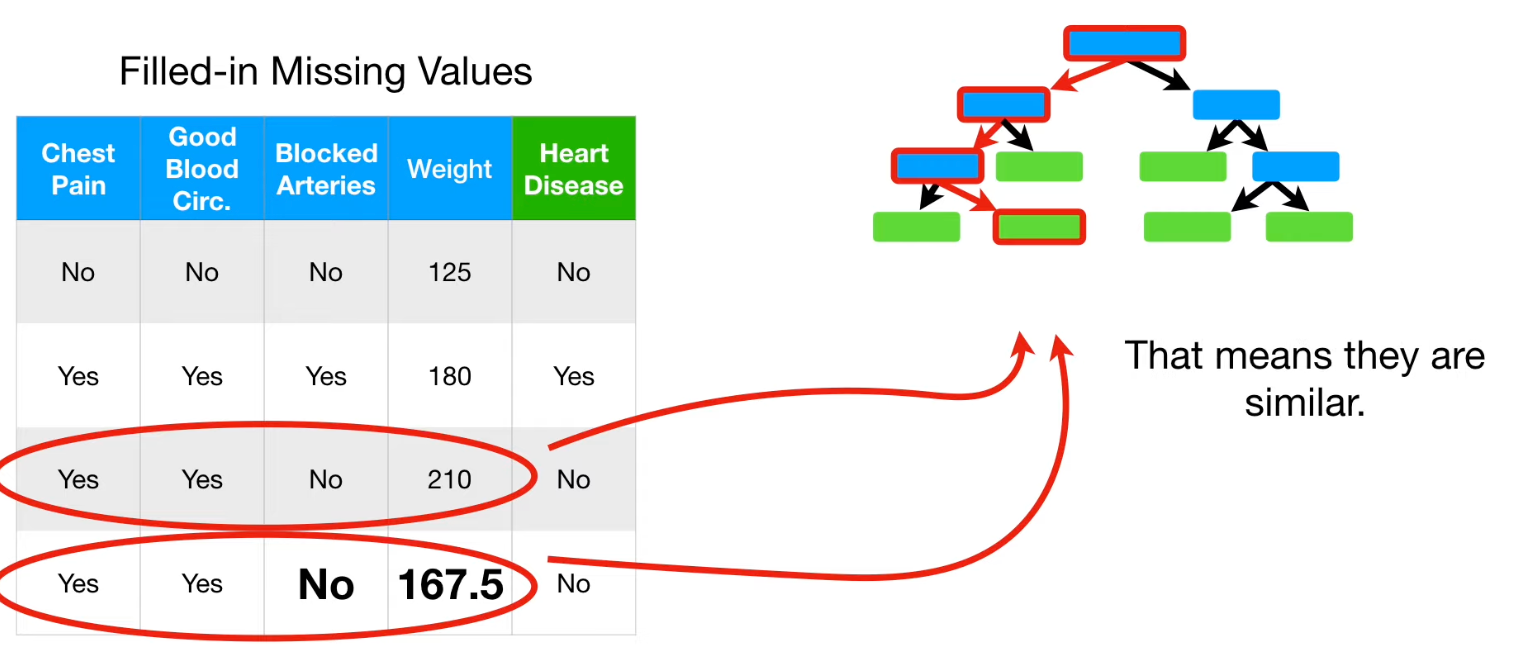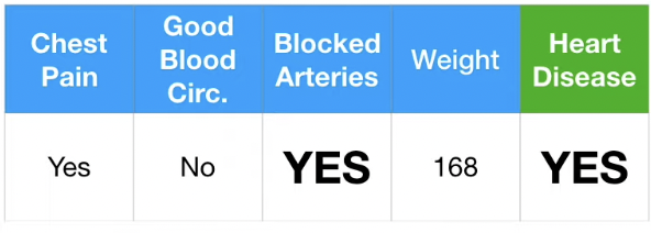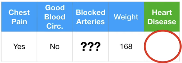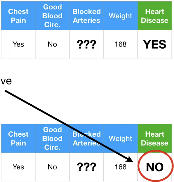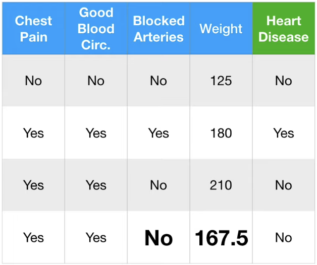 이에 따라 Blocked Arteries 는 "No", Weight 는 (125+210)/2 = 167.5로 Guess 한다.