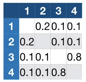 4번 데이터는 1번 데이터와 0.1 , 2번 데이터와 0.1, 3번 데이터와 0.8의 관계가 있다.