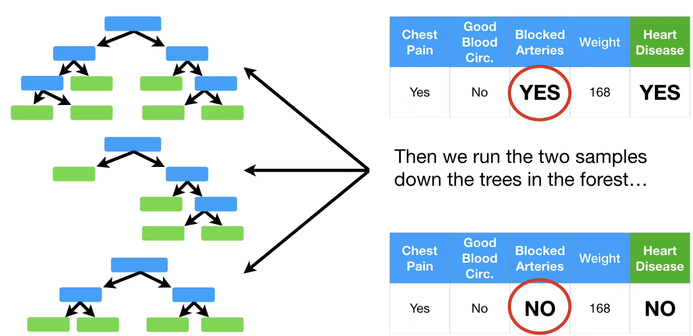 이를 해결하기 위하여 각각의 약 분류기를 생성할 때 사용할 feature의 개수를 지정해놓고 feature를 random sampling하여 각각 다른 feature를 고려한 여러 약 분류기의 tree를 생성하여 의사결정 과정에 참여하도록 한다. (투표로 결정한다.)