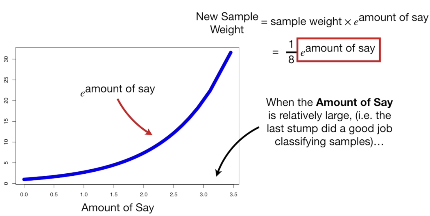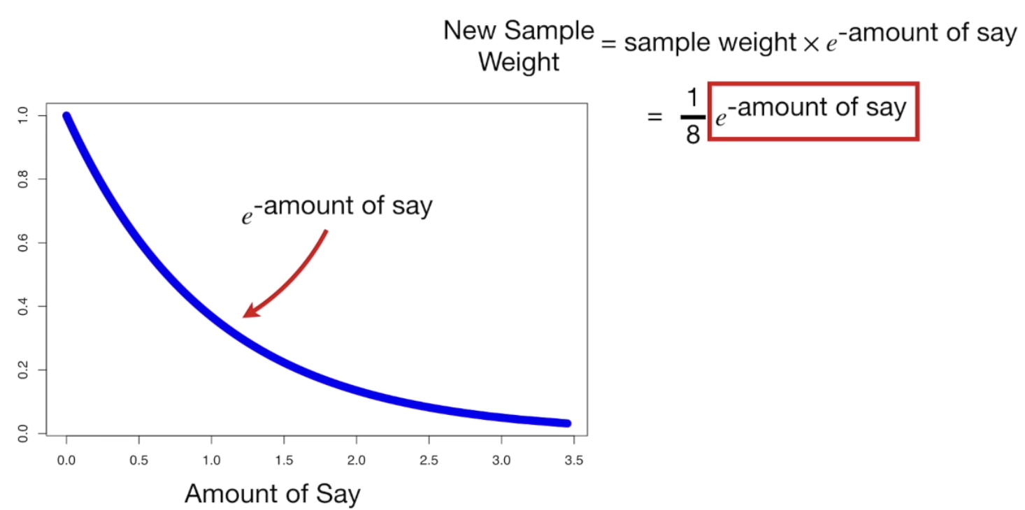 그래프를 통해 알 수 있듯이, 기존의 Sample weight를 amount of say 값에 따라 update한다.
