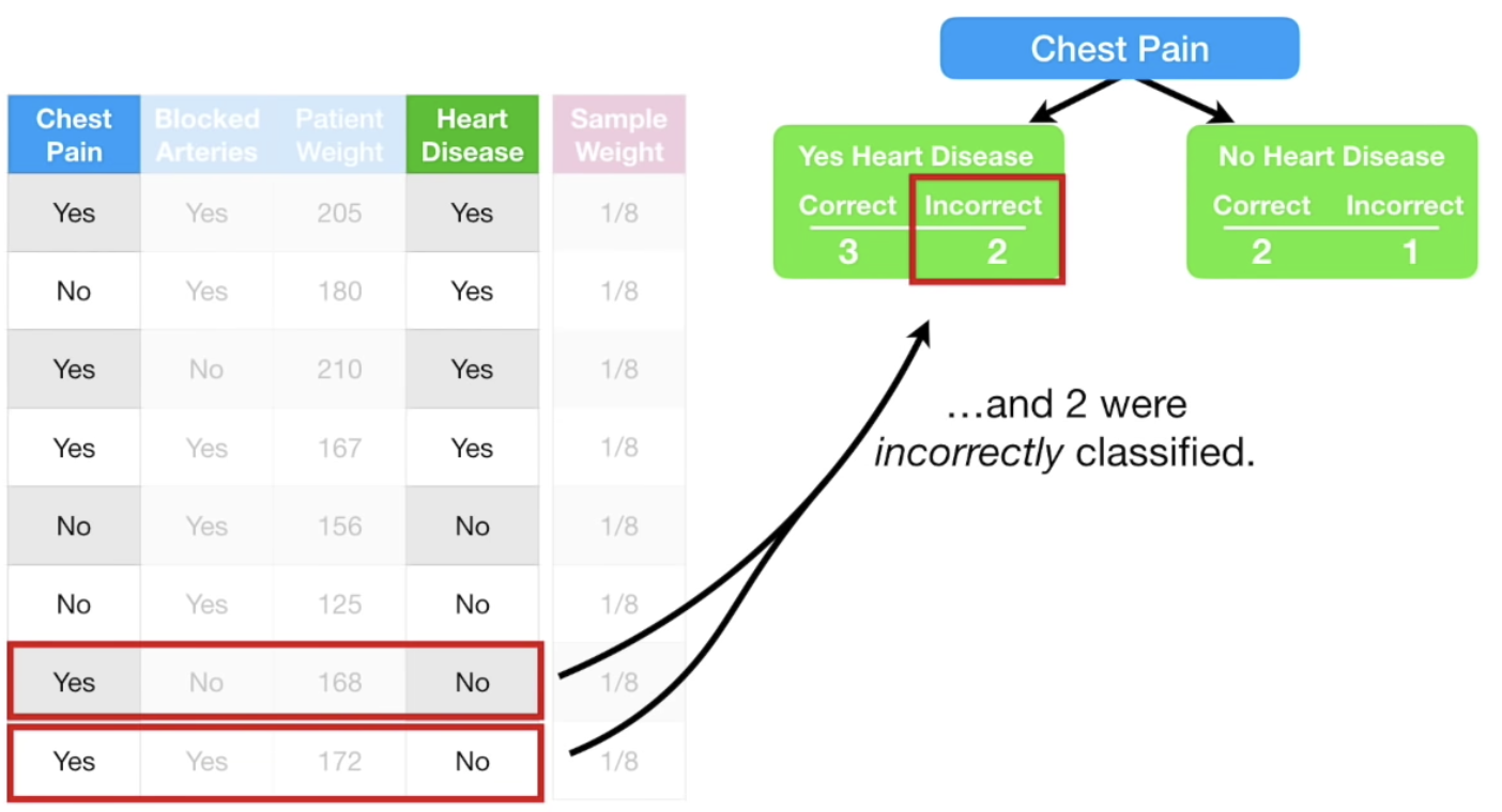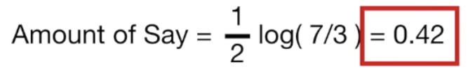 만약 Weight가 아닌 Chest Pain 을 골랐다면 Total Error 가 $frac{3}{8}$ 이고, Amount of Say 는 아래와 같았을 것이다.