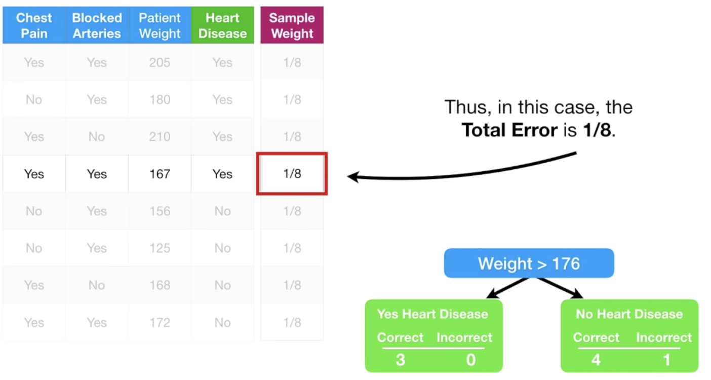 (참고로 Sample Weight의 총 합은 1이다. Total Error 가 0에 가까울 수록 좋은 stump 이고 1에 가까울 수록 나쁜 stump이다.)