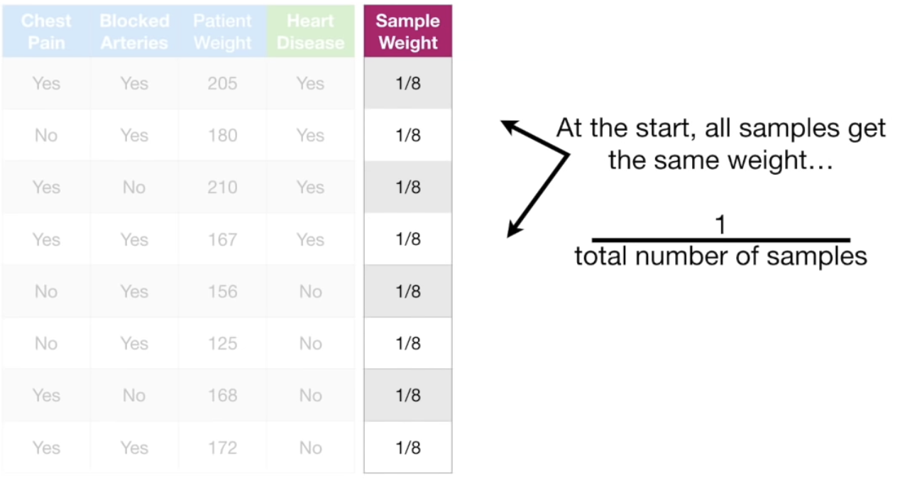 초기 Weight는 전체 데이터 샘플 개수 분의 1 로 한다.
